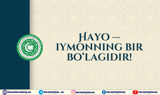 “Аллоҳдан ҳақиқий ҳаё қилинглар”, — дедилар. Саҳобалар “Ей Аллоҳнинг Расули, биз, албатта, ҳаё қиламиз, Алҳамдулиллаҳ”, — дейишди. “Ундоқ емас. Аллоҳдан ҳақиқий ҳаё қилиш, бошни ва у ўз ичига олган нарсаларни, қоринни ва у ўз ичига олган нарсаларни сақламоғингдир. Ўлимни ва (қабрда) чиришни есламоғингиздир. Ким охиратни хоҳласа, дунё зийнатини тарк қилур. Ким ўшаларни қилса, Аллоҳдан ҳақиқий ҳаё қилган бўлур”, — дедилар. (Имом Термизий ривоятлари).