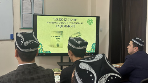 "Имом Термизий" ўрта махсус ислом таълим муассасасига "Кўкалдош" ўрта махсус ислом билим юрти мудири, Имом Бухорий номидаги Тошкент ислом институти “Ақоид ва фиқҳий фанлар” кафедраси доценти в.б., исломшунослик фанлари бўйича фалсафа доктори (PhD) Маъмуржон домла Эркаев томонидан тайёрланган “Фароиз илми” номли янги ўқув қўлланма билим юртининг ўқитувчи ва талабалари фойдаланишлари учун Ахборот-ресурс маркази фондига ҳадя қилинди.