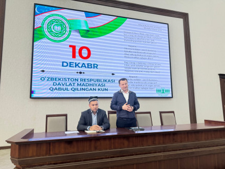 Тадбир давомида талабаларга Давлат мадҳияси яратилиш тарихи, унинг матни ва мусиқаси муаллифлари ҳақидаги маълумотлар тақдим этилди.
